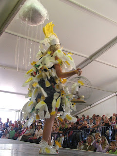 The yellow plastic stuff that they wrap bananas in. It was very clever, see the cutwork on the side [just!] They had cut small flowers into it , the bag was gorgeous too. This won the national contest so they are off to nz too.....